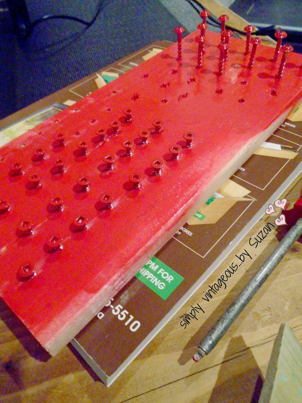The hardest part of this project was screwing in 100 screws - the second hardest was threading the string through the minuscule holes because I couldn't find my glasses ( I thought that was spelled miniscule - thank God for spell check )